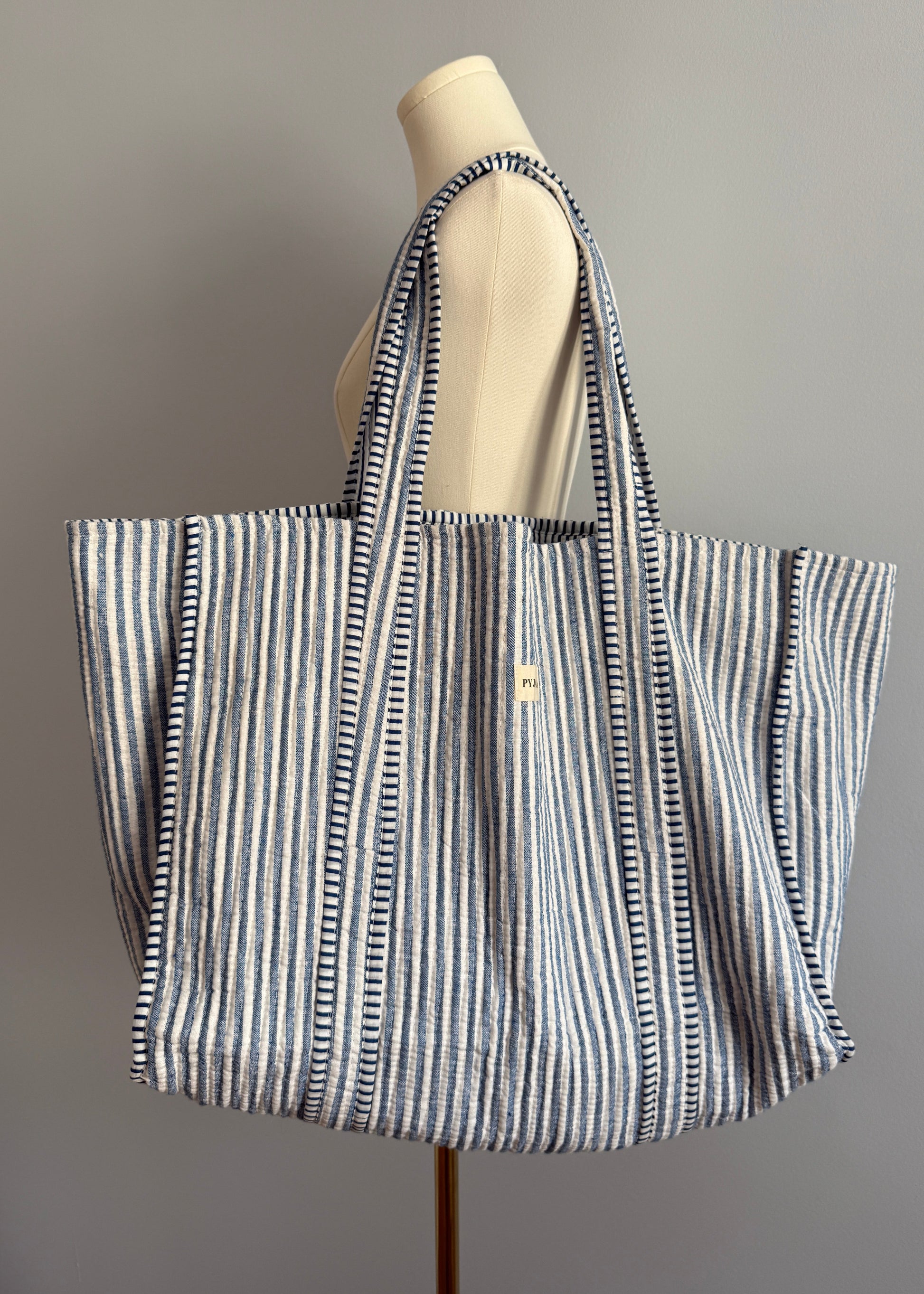 Diese blau gestreifte Tasche wird aus übrig gebliebenen Stoffen unserer vergangenen Kollektionen gefertigt.